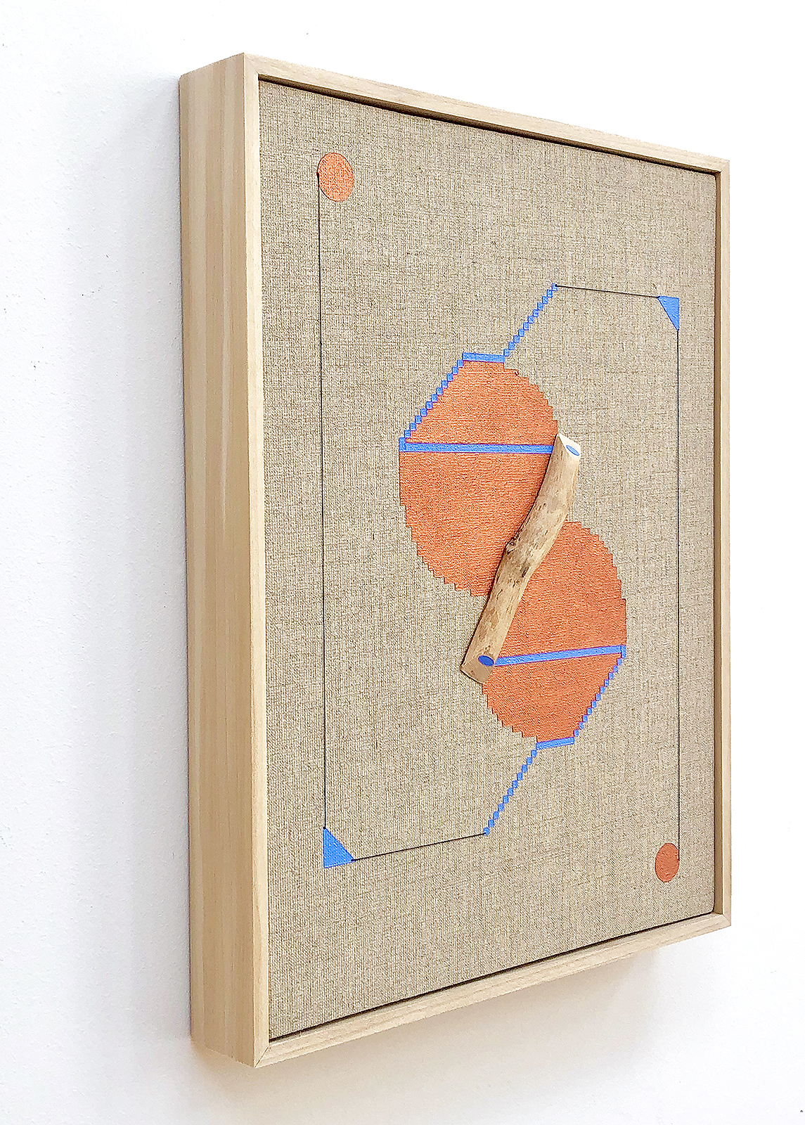 acrylic, iridescent acrylic, pine, thread on linen in artist’s frame