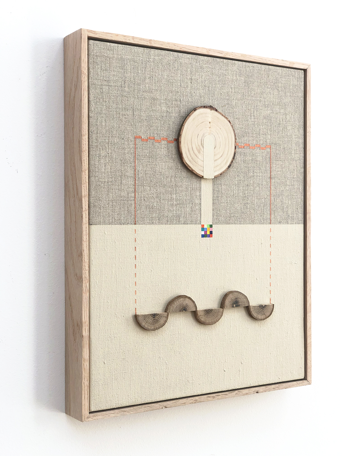 acrylic, iridescent acrylic, oak on linen in artist’s frame