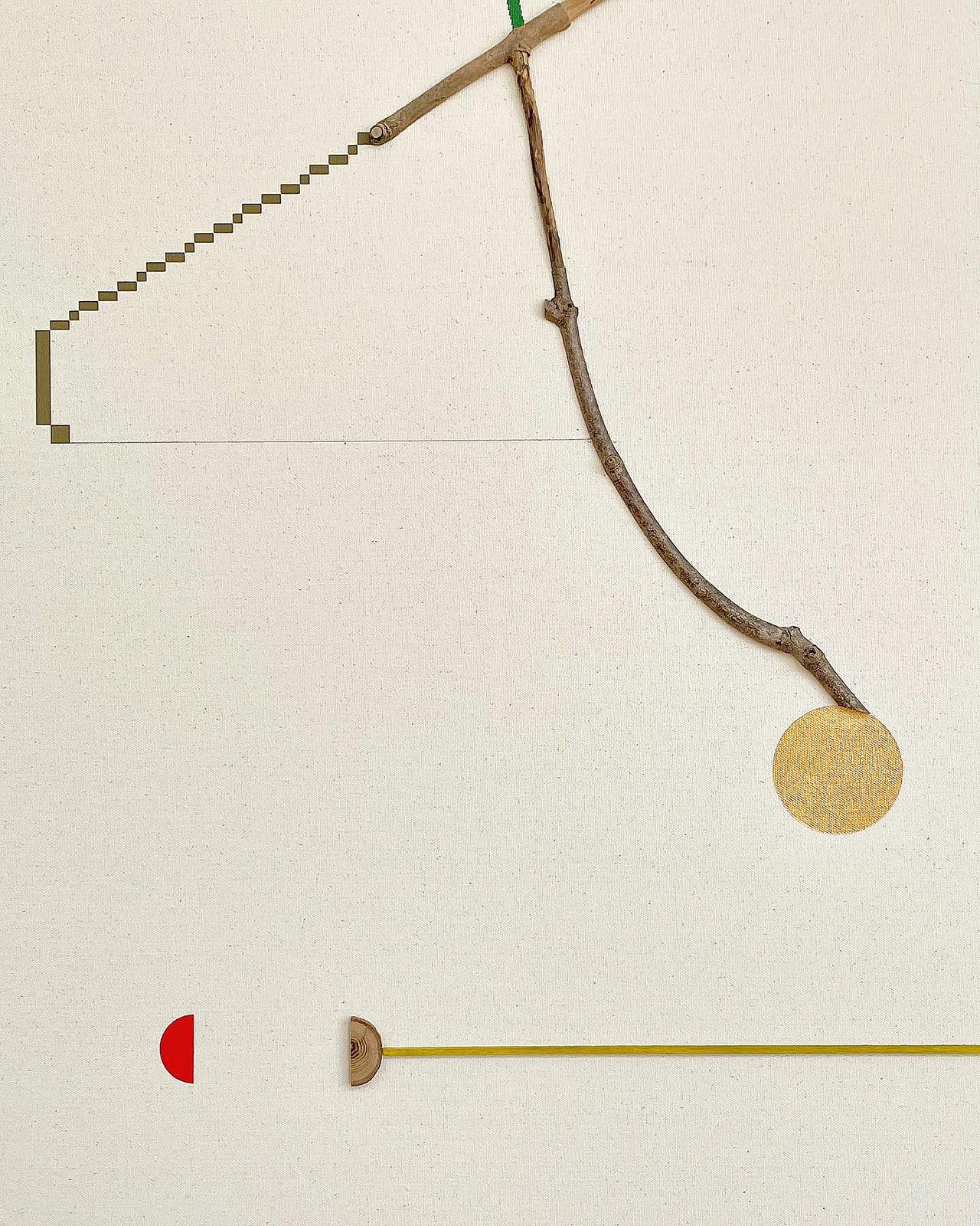 acrylic, iridescent acrylic, flashe, oak, cherry, balsam, pencil, thread on canvas in frame