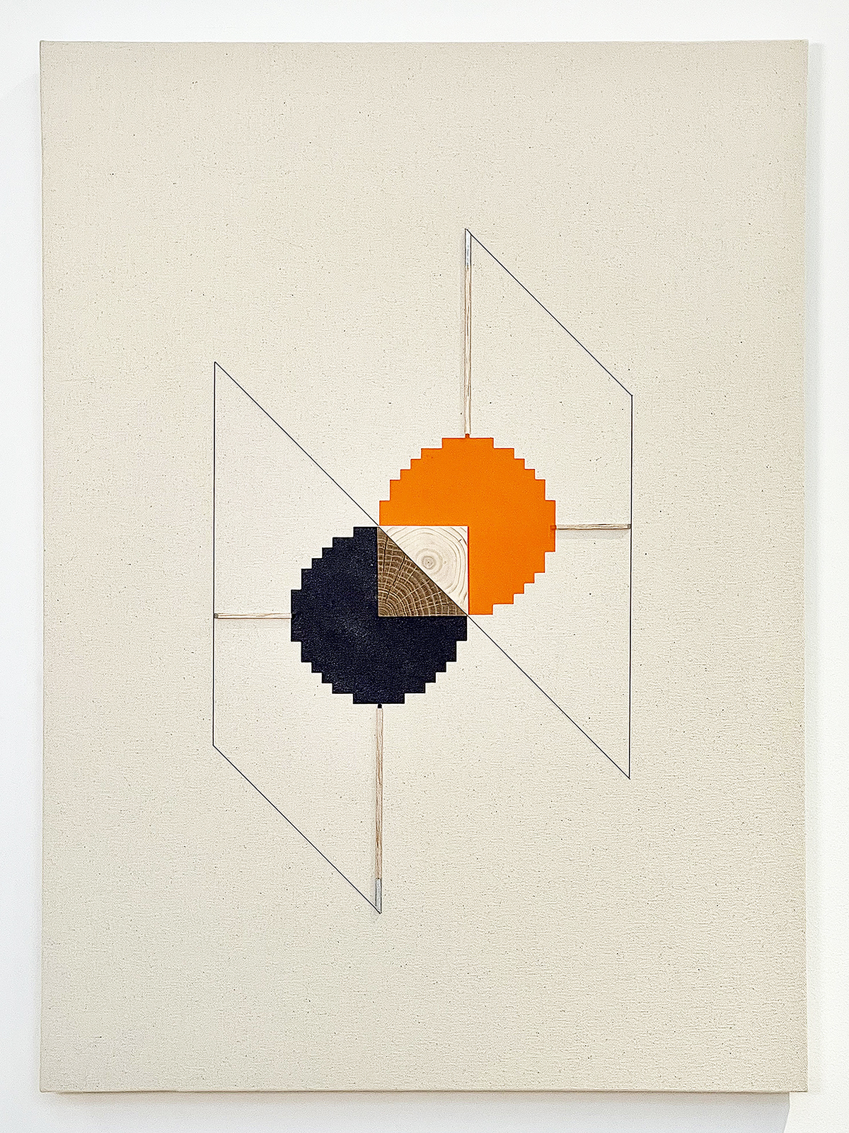 acrylic, iridescent acrylic, flashe, cherry, fir, balsam, thread on canvas