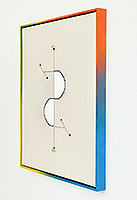 acrylic, various wood species, thread on canvas in artist’s frame