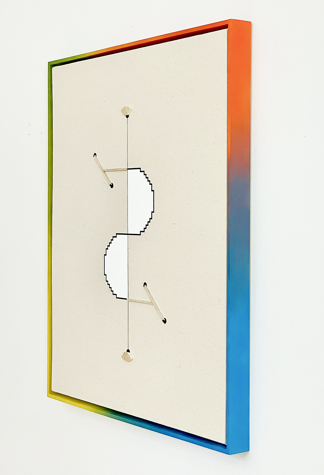 acrylic, various wood species, thread on canvas in artist’s frame