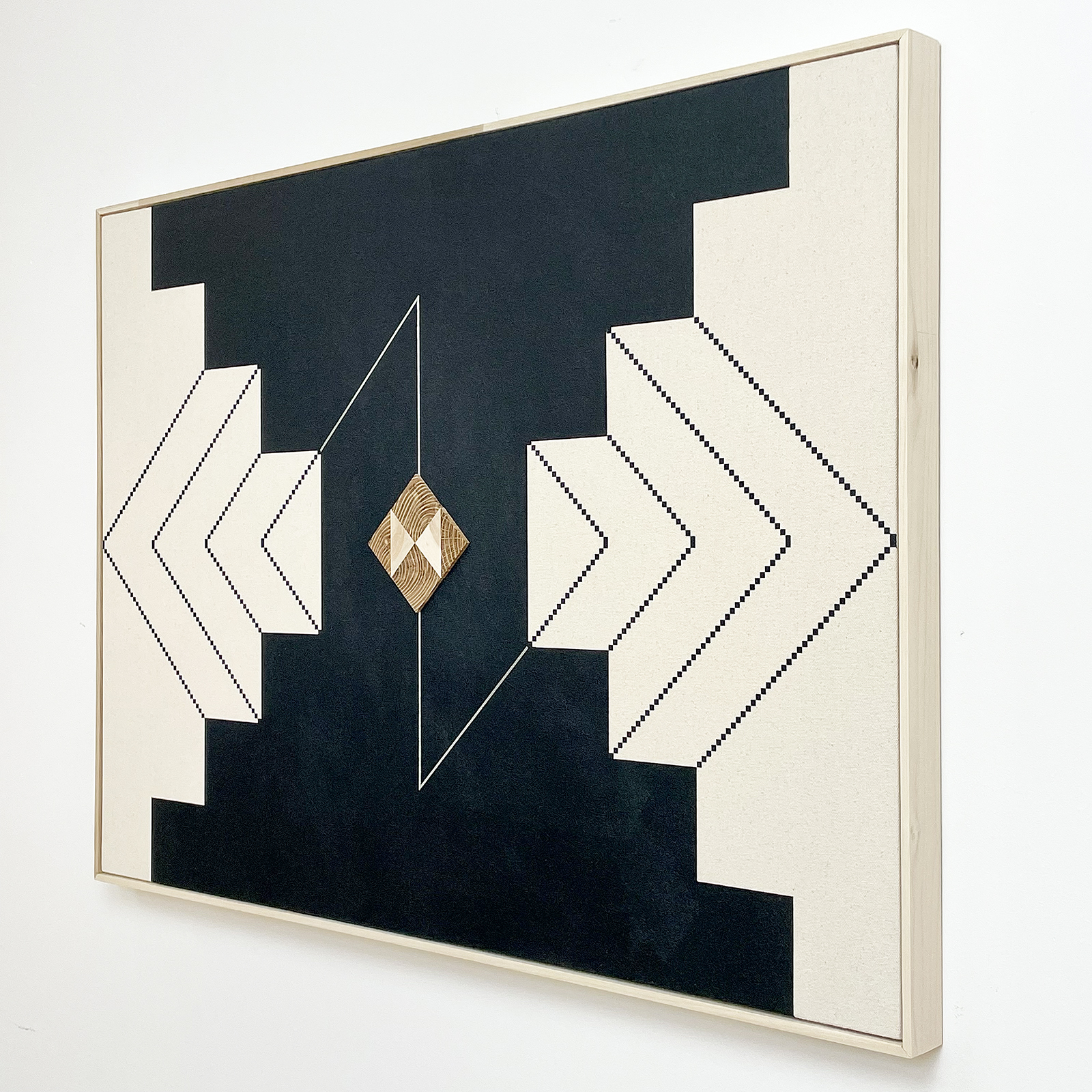 acrylic, iridescent acrylic, cherry, maple on canvas in artist’s frame