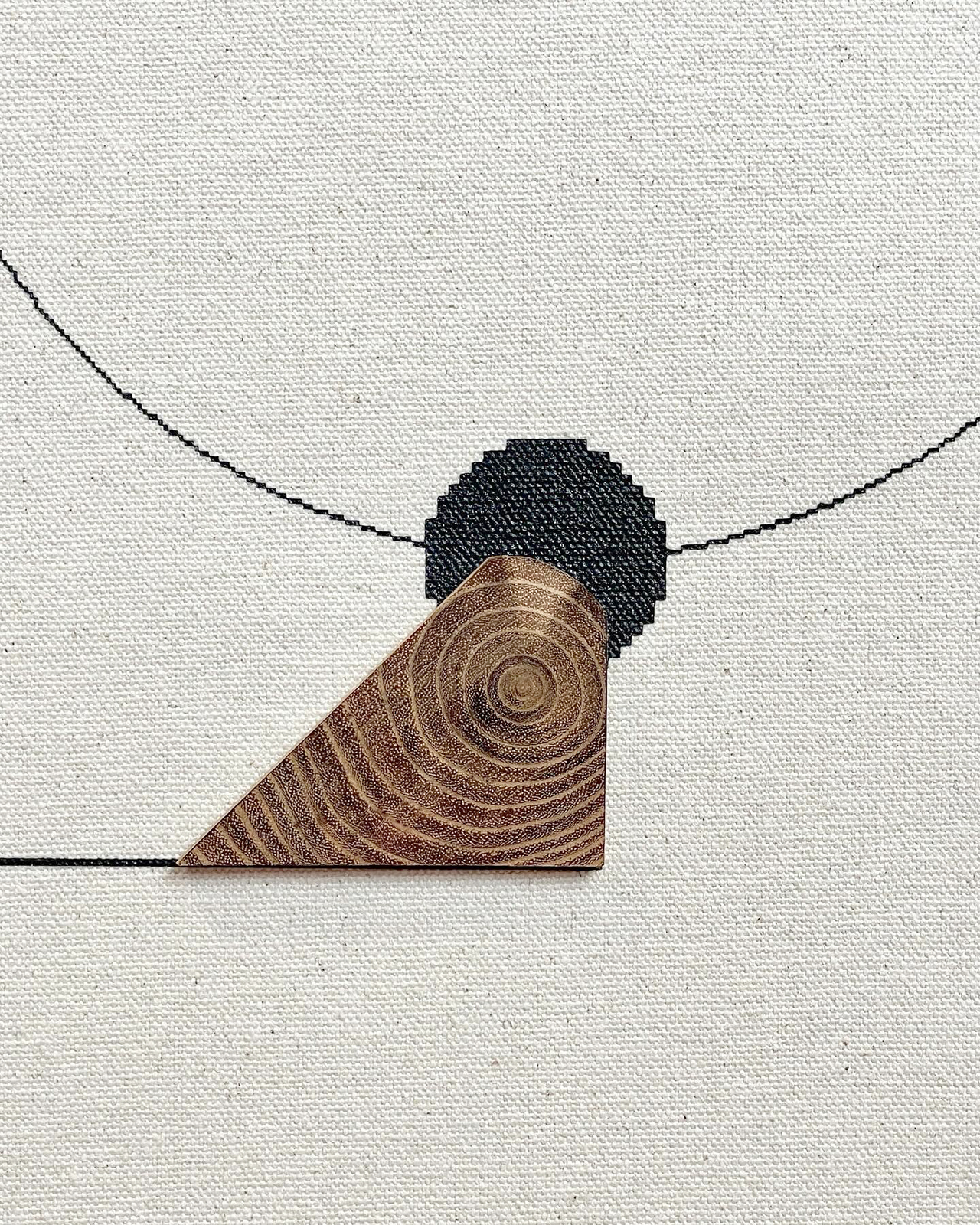 acrylic, iridescent acrylic, various wood species on canvas in artist's frame
